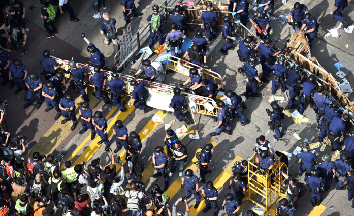 25日,執達主任在旺角亞皆老街展開清理障礙物行動,當日下午4時左右,亞皆老街大部分障礙物已被移除,并基本恢復通車。其後,大批示威者在砵蘭街一帶非法集結,并與在場警務人員發生推撞。截至26日早6時,警方共拘捕116人,罪名包括“非法集結”、“襲警”和“阻礙警務人員執行職務”等。
