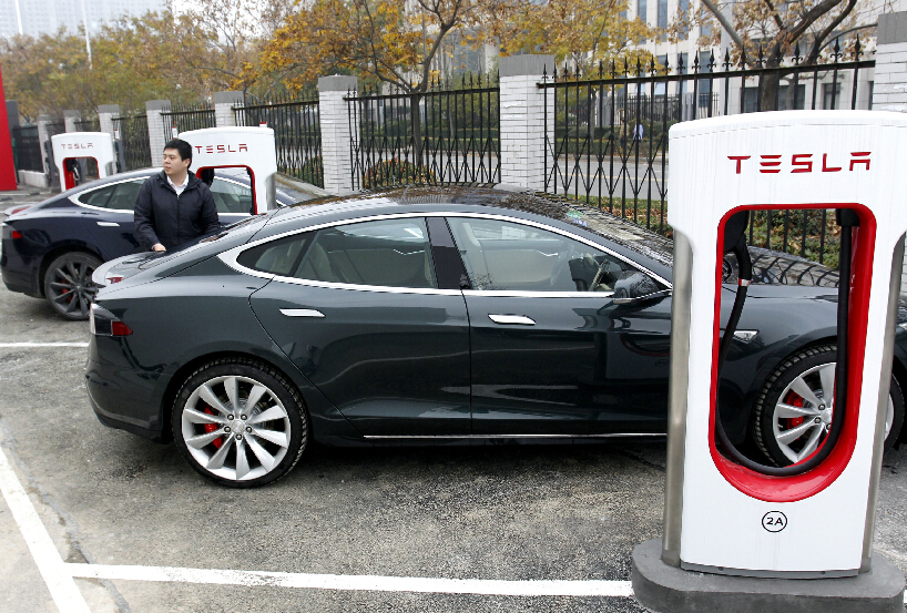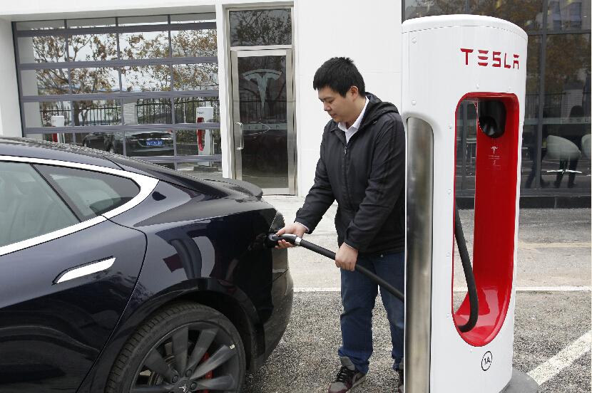 11月26日,特斯拉西安服務中心的員工在充電站里為特斯拉純電動汽車充電。