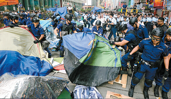 警方以雷霆萬鈞之勢,助執達吏清除「佔旺」的路障及帳幕