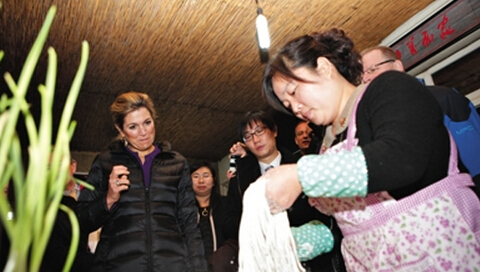 昨日,荷蘭王后馬克西瑪參觀農家樂餐館,村民向她演示做手搟面。 新京報記者高美攝