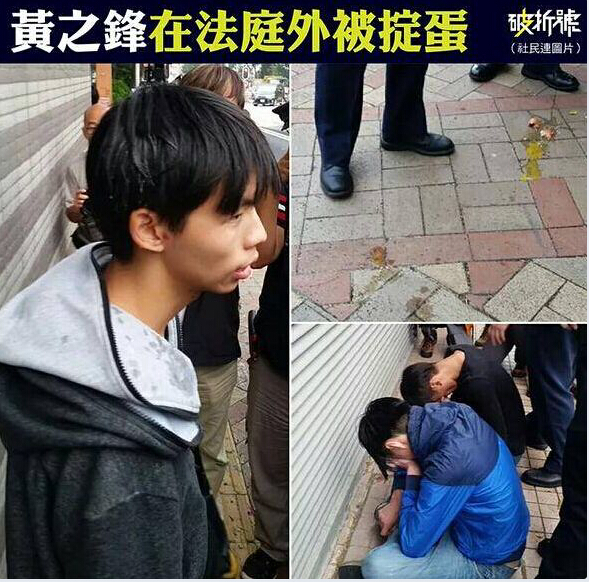 黃之鋒保釋後指,在扣押期間,被嘲諷及辱罵,又指昨日被警員拘捕時遇襲受傷。黃之鋒離開法院時被人投擲雞蛋,擊中頭部,警方帶走兩名涉嫌男子。