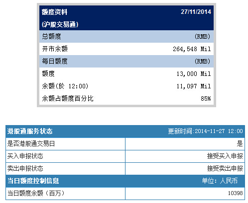 滬港通開通一周半,交易量遠低於市場預期。截止中午12:00,滬股通每日額度消耗15%,淨買入19.03億,還剩110.97億,而港股通每日105億人民幣的額度,到目前使用1.02億,還剩103.98億。