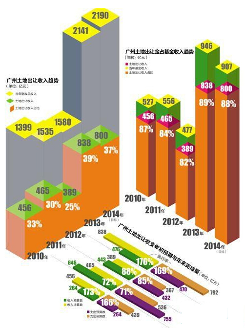 新快报报道指出,回顧最近五年的數據,廣州政府靠土地所獲進賬走出了一條類似心電圖的折線,截至目前約822億元的土地出讓收入,較之2010年約翻了一番。但這筆巨額資金最終流向何處?在全市層面,至今缺少清晰的說明。
