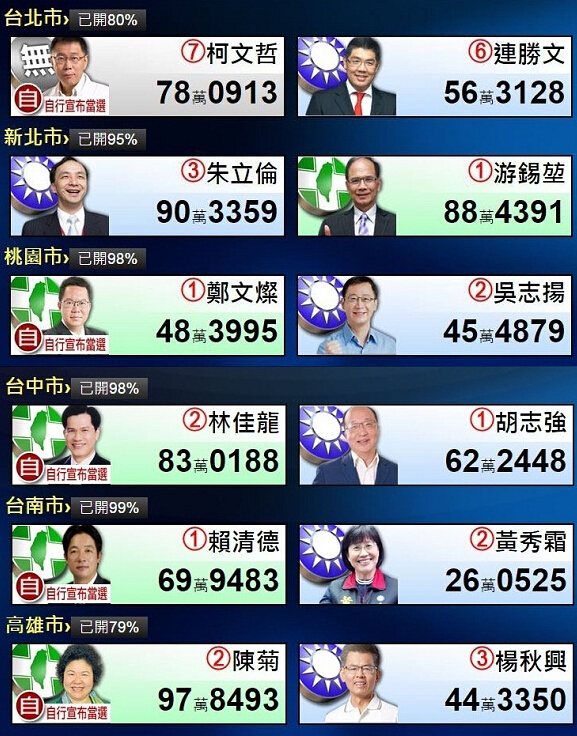 臺中市方面,已擔任13年臺中市市長的胡志強昨晚也自行宣布連任失敗,并對民進黨籍的對手林佳龍表示祝福,并說「天佑臺中」。胡志強稱,選舉的結果雖然大家都知道,一定是贏或輸,但一路走來,選民對他表達的熱情與支持,讓他覺得真的是勝券在望,結果雖然不能說心里沒有準備,但也是意外。至於新北市,國民黨的朱立倫也僅險勝民進黨的對手游錫鹖2.5萬票。