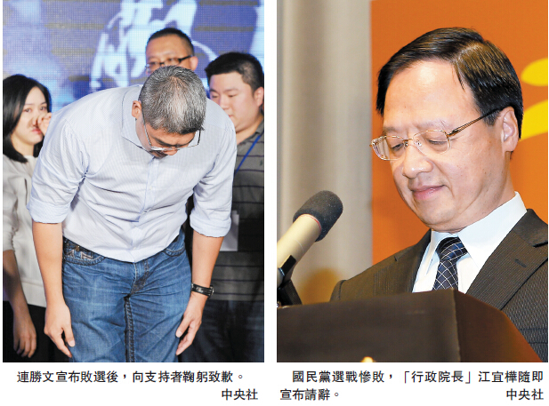 【香港商報訊】臺灣的「九合一」地方選舉國民黨慘敗!多個執政縣市失守,包括最關鍵的臺北市與臺中市,僅新北市的朱立倫險勝對手。「行政院長」江宜樺昨晚宣布辭職,并得到臺灣領導人馬英九的批準。分析稱,馬英九在餘下的兩年領導人任期施政將相當困難。