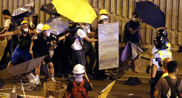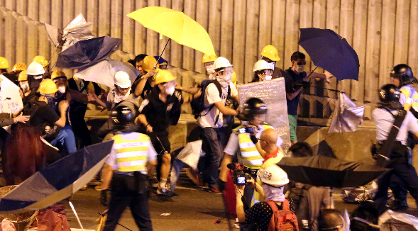 「雙學」昨日傍晚6時在金鐘非法佔領區舉行集會。在一班非主事人上臺發言後,約晚上9時,由學聯常委羅冠聰突然在臺上宣布「圍堵政總」口號。之後,示威人士現場向參與集會人士派發頭盔等裝備。隨即沿添美道、龍和道企圖湧向政總,並與一早在場戒備的警員爆發肢體衝突。期間,警員數度施放胡椒噴劑,更舉起紅旗警告示威者停止衝擊,否則使用武力。不過,全身裝備及帶備自製盾牌的示威者無視警告,繼續以雨傘襲擊警員,甚至試圖搶走胡椒噴劑,警員制服及帶走多名示威者。