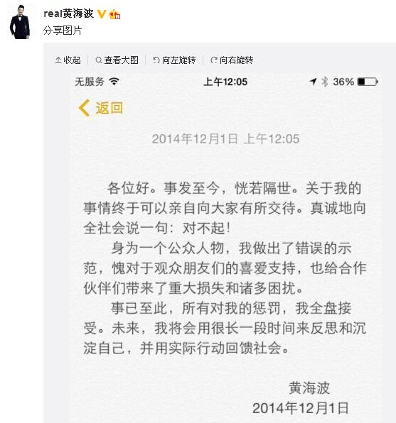 黃海波釋后發聲明:愧對觀眾 所有懲罰全盤接受