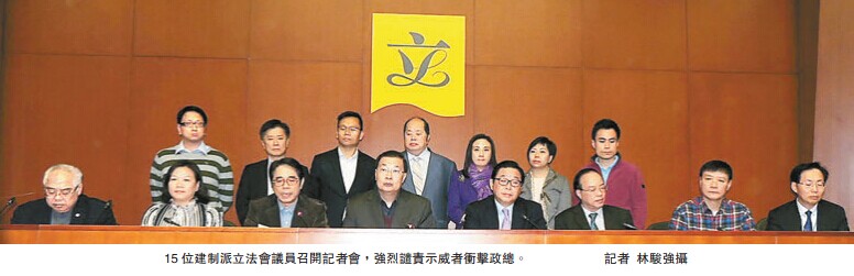 15位建制派立法會議員昨午召開記者會,由民建聯主席譚耀宗宣讀41位建制派議員針對前晚衝擊劣行的嚴正聲明。譚耀宗指出,「雙學」多名負責人前晚先後進入立法會大樓,並在10樓泛民議員辦公室,意圖以大樓作為包圍及暴力衝擊政總的「指揮部」,他們感到十分憤怒。他說,立法會是莊嚴之地,不能容忍有人將大樓變為違法活動的指揮部;他批評如進入大樓的「雙學」成員與大樓外示威者裏應外合,大樓及人員安全將受極大威脅。