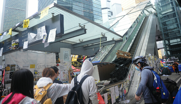 違法「佔領」行動昨日邁入第65天,示威者由前晚至昨早數度堵塞龍和道,嚴重影響金鐘交通,導致政府總部昨早停開,直至下午才恢復運作。當日下午,由金鐘海富中心通向政府總部的行人天橋雖然有障礙物,但沒有示威者留守,有警員在場戒備,公務員向保安人員出示證件便可以直入政總。部分公務員繞道而行,經過添馬公園步向添華道,使用政府總部西翼入口。有公務員表示,示威者應該反省抗爭的手段,以免影響政府部門的正常運作。