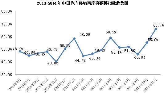 中國汽車流通協會發佈的“中國汽車經銷商庫存預警指數調查”VIA(Vehicle Inventory Alert Index)顯示,2014年11月庫存預警指數為65.7%,比上月上升了10.7個百分點。
