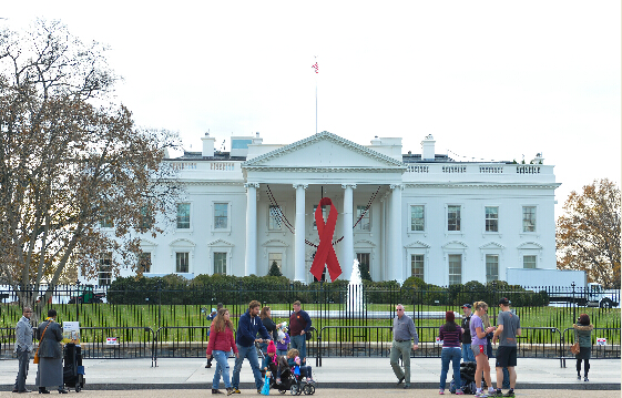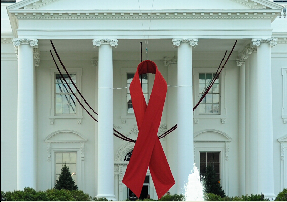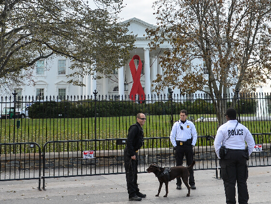 12月1日,在美國首都華盛頓,白宮門前懸掛紅絲帶,以紀念世界艾滋病日。
