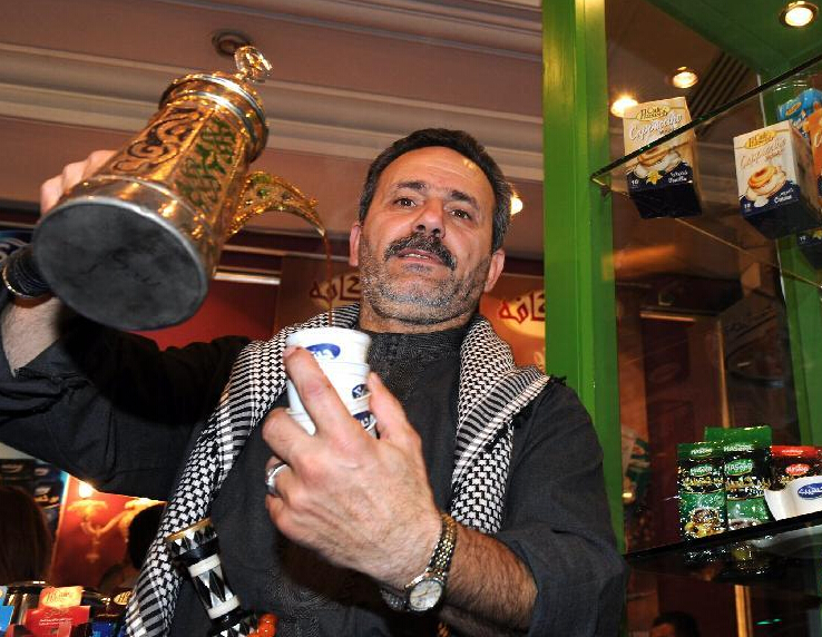 在敘利亞首都大馬士革玫瑰酒店,一位參展商在2014食品展覽會上介紹自制咖啡。