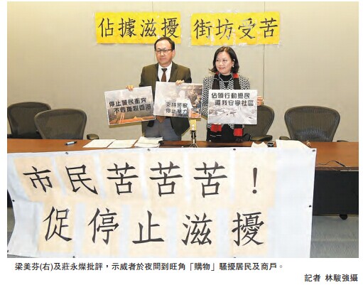 經民聯立法會議員、西九新動力主席梁美芬,昨日聯同西九新動力油尖旺區議員莊永燦舉行記者會,指出旺角清場後出現的所謂「鳩嗚」行動,對於該區居民及商戶造成更大的困擾。本身是律師的莊永燦表示,原本旺角清場過後,居民及商戶都一度「感到開心」,以為該區會出現「昇平」局面,不過,其後示威者入夜後不時於西洋菜街、上海街等地集結,並以「購物」為名示威為實,不僅阻礙馬路,又不斷在商舖前團團轉、起哄。