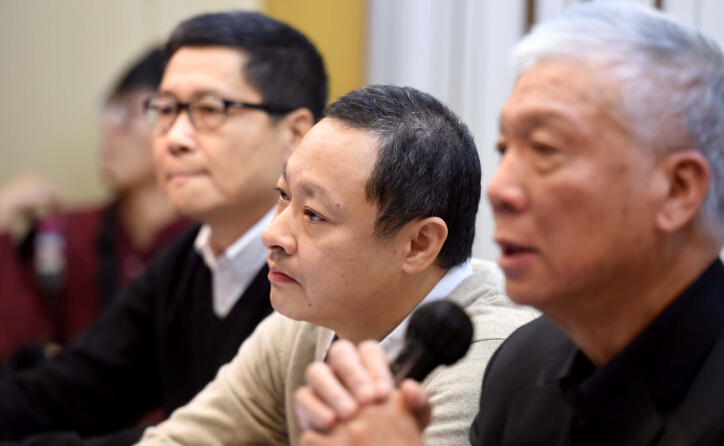 昨日,香港违法“占中”发起人戴耀廷(中)、陈健民(后)、朱耀明表示,将于3日向香港警方自首。中新社