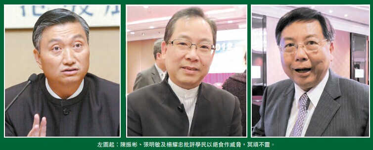 另外,多位港區人大代表狠批絕食行為。九龍社團聯會會長、青年事務委員會主席陳振彬不認同絕食這種形同「威脅」的爭取方式,認為極具「小朋友撒賴」的味道;他說,市民已經厭惡「佔領」行動,絕食代表了反對派的最後一步;重申政改應要跟從《基本法》及人大常委會規定。