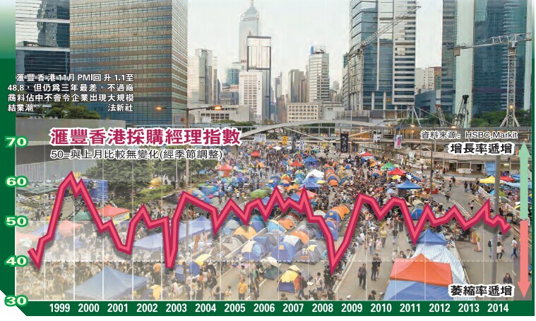 佔中不但影響金融市場,更令實體經濟發展受損。滙豐香港11月PMI較10月份的47.7有所回升,但亦只有48.8,低於50的盛衰分界線。滙豐經濟研究大中華區經濟師朱日平於評論香港PMI的調查結果時表示:「儘管收縮程度已放緩,但香港經濟依然走弱。目前有更多證據顯示,企業由於經營活動縮減,議價能力下跌,其利潤率正備受擠壓。」