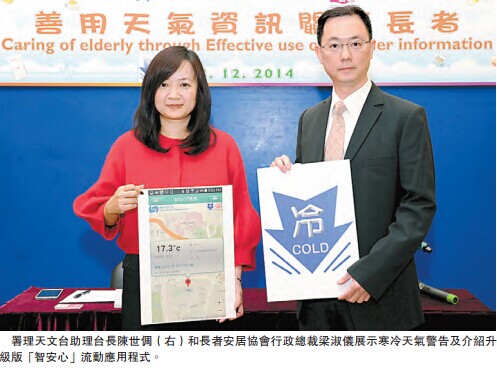 另外,天文臺和長者安居協會合作,最快本月下旬推出加入天氣資訊的升級版「智安心」流動應用程式,以切合長者和護老者的需要。升級版「智安心」應用程式的介面會顯示現正生效的天氣警告圖示、使用戶外「平安服務」主機的長者所處的分區天氣資料、紫外線指數,以及由環保署提供的空氣質素健康指數。此外,當長者身處位置附近的氣溫超出特定範圍,使用應用程式的護老者會接收到特別天氣提示。