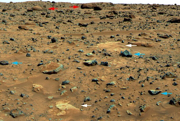 華林表示:“美國宇航局當然注意到它,卻沒有說明使用這個箭頭的原因。”但查找美國宇航局照片庫中的這張照片就會發現使用這些箭頭的真實原因。美國宇航局說:“遠處用紅色箭頭作出標記的巨大圓形岩石可與Yogi相提並論。”Yogi以前由索傑納火星車發現,是火星發現的第一塊由玄武岩構成的岩石。它表明火星曾有火山噴發。而它的平滑度暗示了這個紅色星球曾有一個潮濕環境。