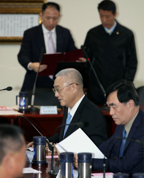 12月3日,中国国民党主席马英九在该党中常会上请辞党主席职务。根据党章,现任第一副主席吴敦义(中坐者)担任代理主席。