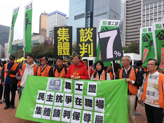 職工盟約50人發起遊行,要求企業於明年加薪7%,以及落實集體談判權。