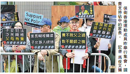 保衛香港運動成員昨手持「子女犯法·泛民賤格·父母有責」、「家長糊里糊涂,子女誤入歧途」等標語,在警總對面舉行集會。集會期間,多次高叫「支持警察嚴正執法」、「暴徒賤格·煽動犯法」等口號,又播放警察執勤片段,及唱歌聲援警察。