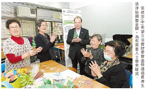 【香港商報訊】記者周偉立報道:長者生活津貼實施至今快將兩年,勞工及福利局局長張建宗昨於網誌撰文表示,當局將根據既定調整機制,向財委會提交金額調整建議,由現時2285元上調至2390元,升幅4.7%,有關建議受立法會拉布影響,推行時間表無可避免順延,他希望立法會財委會冰封的情况能盡快解凍,為有需要人士帶來暖流。