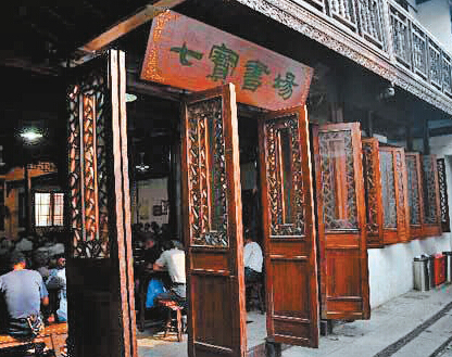 七寶最有老街、古味的要算上「七寶書場」。走進白木臺子、登子的茶室,穿過石板鋪地的天井,盡頭是一幢二百多平方米的舊屋,跨進大門只見古味的四壁和烏黑的屋頂,以及一個簡單的說書臺立在正中前方,十幾排舊長凳排列臺前,每個長凳的背后有一塊狹長板條,可放茶杯與茶壺。當你坐在真正的明清建築內,享受著真正明清書場的氛圍,聽著說書老前輩的《清宮十三朝》的評話,將使人悠镕自得其樂!