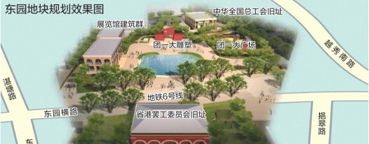 東園地塊項目位于東濠涌高架西側,西至湛塘路,東至越秀南路、挹翠路,南至國利大廈,北至中華全國總工會舊址北側規劃路。地塊內現狀有大量文物建筑,從南往北,分別有東園門樓、省港罷工委員會舊址、東園、團一大廣場和中華全國總工會舊址。