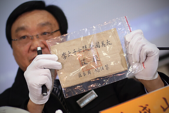 侵華日軍南京大屠殺遇難同胞紀念館館長朱成山介紹由南京金陵文獻館館長、民間收藏家徐雷捐贈的“大美國金陵女子大學”袖標,