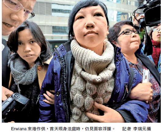 23歲的Erwiana Sulistyaningsih上午由警方提供的專車送達高院,在門外受到支持團體慰問,她在庭上供稱,在來港前接受了8個月的女傭訓練,於去年5月27日首次來港工作,抵港3日后,被告把她接回將軍澳富康花園的家中。Erwiana指,她被規定每日只可在下午1時至6時期間睡覺,不可睡超過4小時,其餘時間均需工作,遲了起床會被打。另外,她每日只可吃兩餐,包括3片麵包及1碗飯,時間規定在起床完成工作后及睡覺前。