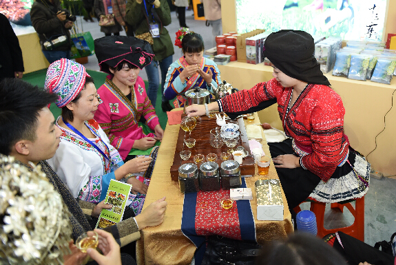 在第七屆廣西名特優農產品交易會現場,一名女子在推介來自廣西龍勝各族自治縣的茶葉。
