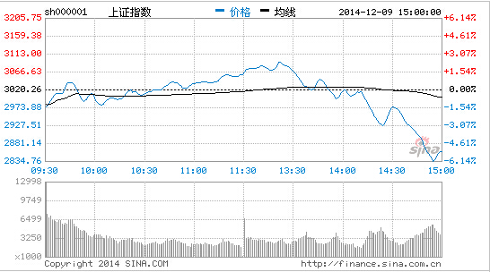 新浪財經訊 12月9日消息 滬指低開後震蕩走高,午後在券商、煤炭、自貿區、機場航運、鋼鐵等板塊帶動下一度大漲逾2%沖擊3100點關口,創49月新高,上探3091.32點,之後滬指高台跳水近200點,劇震近9%,深成指低開之後沖高回落,振幅超6%,創業板低開震蕩走低,兩市成交超萬億再創新高。