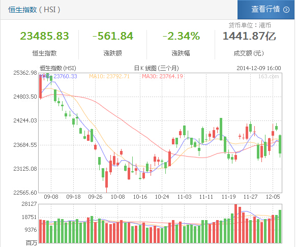 網易財經12月9日訊 恒指今日低開低走,午後跌幅擴大持續擴大,最低時跌至23399.87點,挫648點,臨近收市時,跌幅稍微收窄。恒指今日再跌至24000點重要關口之下,失守50天線。