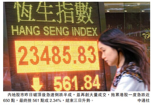 【香港商報訊】記者陳薇報道:內地股市昨日破頂后急速倒跌半成,并再創大量成交,拖累港股一度急跌近650點,最終挫561點或2.34%,結束三日升勢。國企指數跑輸,收報11332點,跌540點或4.55%,成交維持活躍,達1441億元,是連續七日成交額破千億元。港股昨日跌勢,蒸發市值5700多億元,令總市值跌穿25萬億元的關口,降至24.7萬億元。另外,騰訊(700)主席馬化騰連日減持騰訊,套現近30億元。