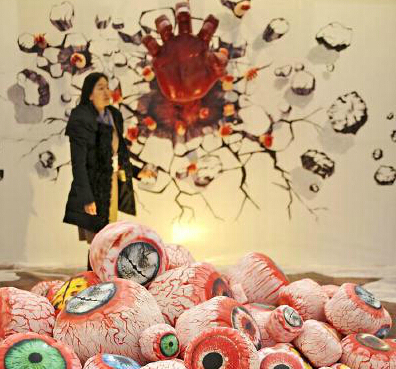 12月5日,一位觀眾在觀看烏魯木齊市一家廣告公司的創意作品。