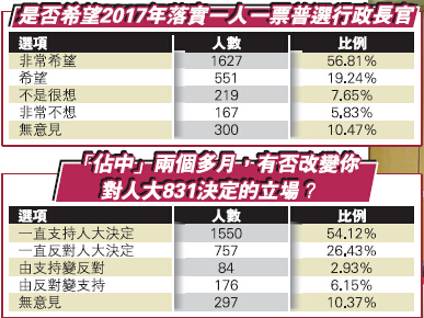 結果發現,有超過七成半被訪者表示希望及非常希望2017年能夠落實「一人一票」普選,結果與4月的調查結果相約,有近五成半人表示一直支持按全國人大常委會決定落實普選,六成民意認同人大決定是極具參考意義的數據,僅得不足三成人指一直反對人大決定;與以往結果比較,因違法「占中」而改變立場的市民雖只得不足一成,但「占中」使市民越來越傾向支持人大決定。