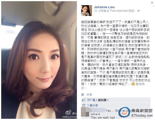 10日中午,劉喬安用另一帳號重啟Facebook,發文拜託各界向她介紹厲害的律師,還激烈呼籲:“我真的不是公眾人物也沒傷害人,為什麼一直要中傷我。我的命從學運到現在幾乎是一直僥倖撿回來的,是不是真的要把我逼死了,家破人亡,全家被指指點點,想傷害我的人才會停止?如果這次再不提告,再不動作,再不請大家幫我肉搜(人肉搜索)欺負我的變態,下次是不是要說我走私軍火?”
