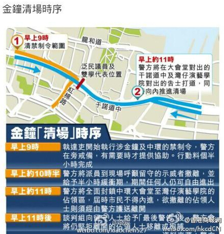 消息指,警方今早九時半至十時半,會協助執達主任,執行金鐘禁制令,之後接手清理占領區,會有半小時讓示威者收拾私人物品,到早上十一時封鎖禁制令一帶馬路,不可自由進出。示威者若拒絕離開,會被拘捕;警方相信用一天時間,可以完成清場行動。