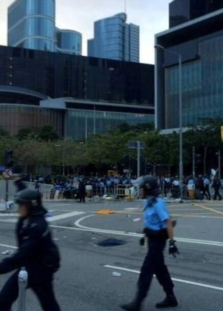 警方繼續在金鐘夏慤道清場,留守人士坐在政總西翼對出的馬路,警方原先逐一拘捕他們,傍晚開始警方改為對一排十多名示威者,採取行動。