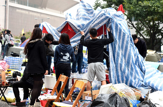 金鐘占領區清場在即,部份占領人士已經收拾物品離開,但現場亦有人將雜物棄置在路上,試圖拖延清場。數名大專學者穿上學袍到場,宣稱要監察警方執行清理行動。