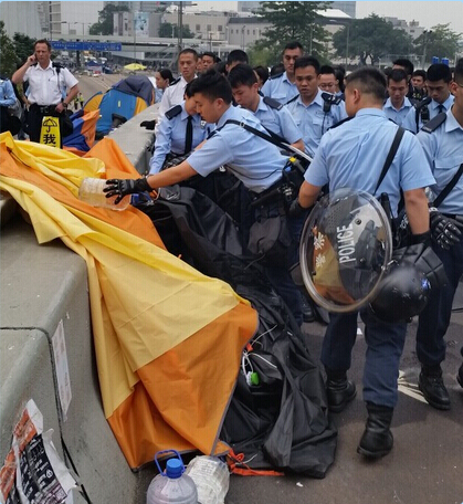 警方早上將在金鐘占領區清場,在紅綿路,已經有警員在場視察。而在占領區,部分示威者睡醒,開始收拾個人物品,以及拆去帳篷。其中一個物資站的帳篷已經拆卸,有義工將剩馀物資放入膠箱帶走,但仍會留下一些生理鹽水,為清場作預備。有占領人士話,覺得被警方拘捕是不值得,所以會離開。