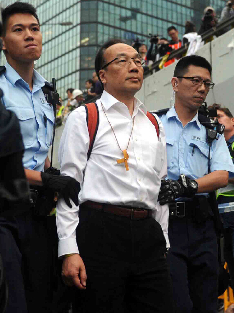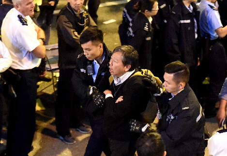 港警依法对金钟非法“占领区”全面清场。图为立法会议员何俊仁被警察带走。中通社