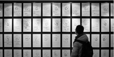 在南京民間抗日戰爭博物館,一位參觀者觀看抗戰老兵的手印墻。