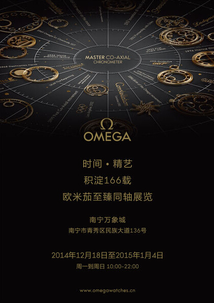 為展現品牌先鋒精神和對制表藝術的卓越貢獻,瑞士著名鐘表品牌歐米茄將于2014年12月18日至2015年1月4日,在南寧萬象城中庭榮耀呈現“時間·精藝”至臻同軸展覽。展覽中的多件時計臻品完美詮釋歐米茄行業領先的制表技術。通過參觀導覽和炫目的機芯展示,歐米茄與媒體和貴賓將共同見證貫穿歐米茄品牌發展之路的創新精神,領略廣受贊譽的同軸機芯之美。