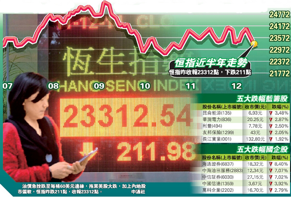在中外利淡因素夾擊下,港股跌211點。國際原油價格屢創新低,加上市傳油價持續下跌或引發企業債務危機,拖累美股全面向下,道指大跌268或1.5%。恒指低開255點后,最多曾跌355點,低見23169點,失守牛熊線(23231點),其后一度受惠A股倒升,跌幅曾收窄至161點,高見23363點,惟最終跌211點,收報23312點。