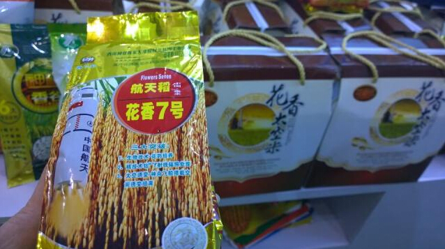 在科技展區里,四川神龍股份有限公司的“花香”系列太空米十分搶眼——搭載過神舟三號宇宙飛船,在強輻射、微重力、高真空、弱磁場的宇宙中玩了一把“星際穿越”,由四川農業科學院培育成了全新的大米品種。這種太空米粒長,外觀品質好,口感香濃。