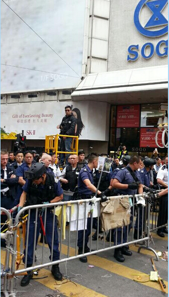 香港電臺報道,一批戴頭盔,身穿藍色制服的警方特別戰術小隊,在約10時20分于怡和街崇光百貨對開推進,先用鐵鉗剪開索帶,移除鐵馬。