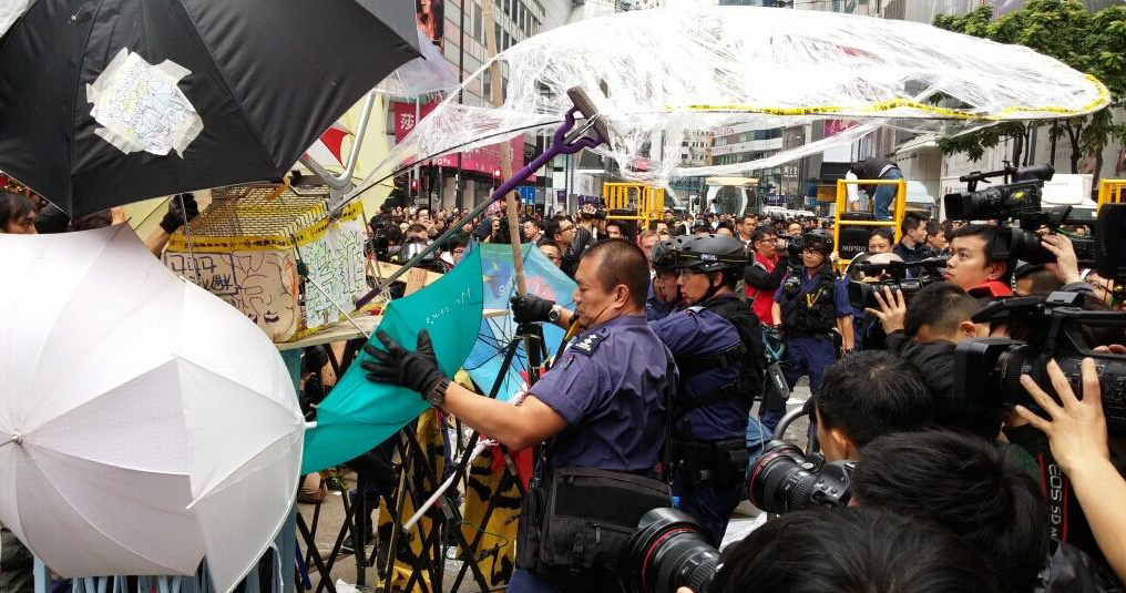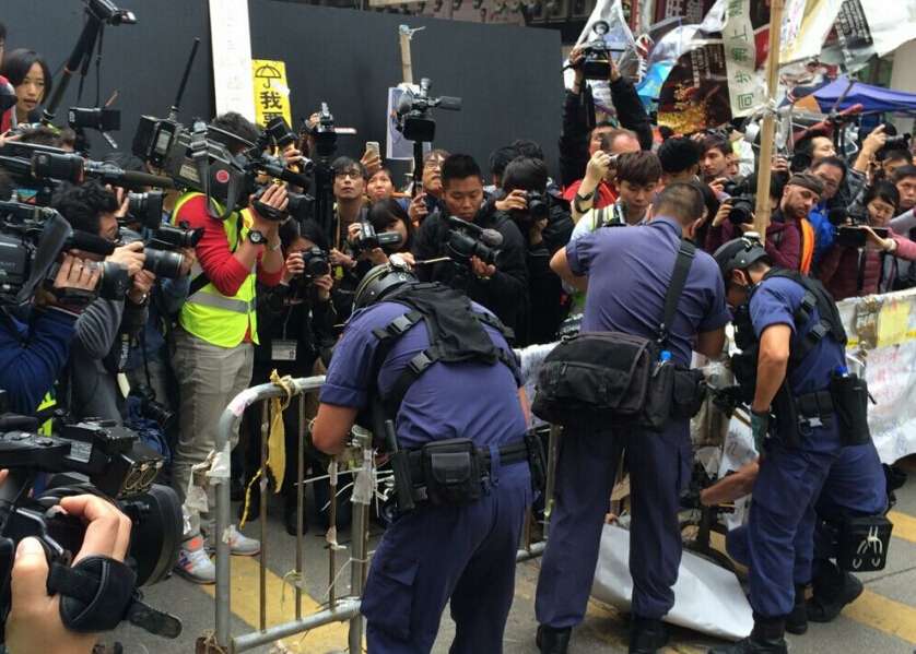 警方一批特別戰術小隊成員,上午十時二十分開始清拆铜鑼灣占領區路障,以鐵剪清除綁住鐵馬的膠索帶。怡和街東西行全線封閉,警方又在占領區附近一帶,設立封鎖區,禁止任何人士進入,離開市民亦需要登記個人資料。現場留守的占領人士,未有作出阻撓及反抗行動。另有十多人就坐在占領區,準備被捕。