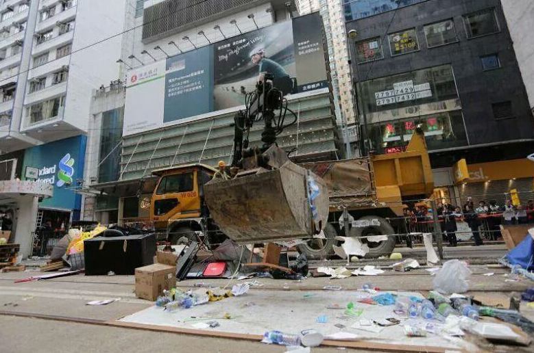 其后3輛夾斗車進場夾走障礙物。香港食環署派出大批清潔工人清理街道,包括“占領者”遺下的貼紙。