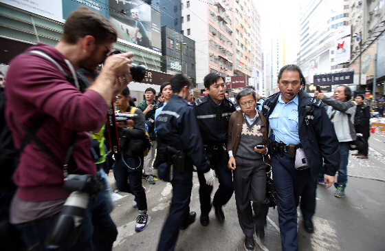 在清場期間,10多名占領人士不愿離開,在占領區靜坐,警方在多次勸喻無效后,以涉嫌妨礙警務人員執行職務將他們拘捕,并由警方安排的車輛載走。期間,全部被捕人士在警方協助下自行步上警方準備的旅游車,無人被抬走。